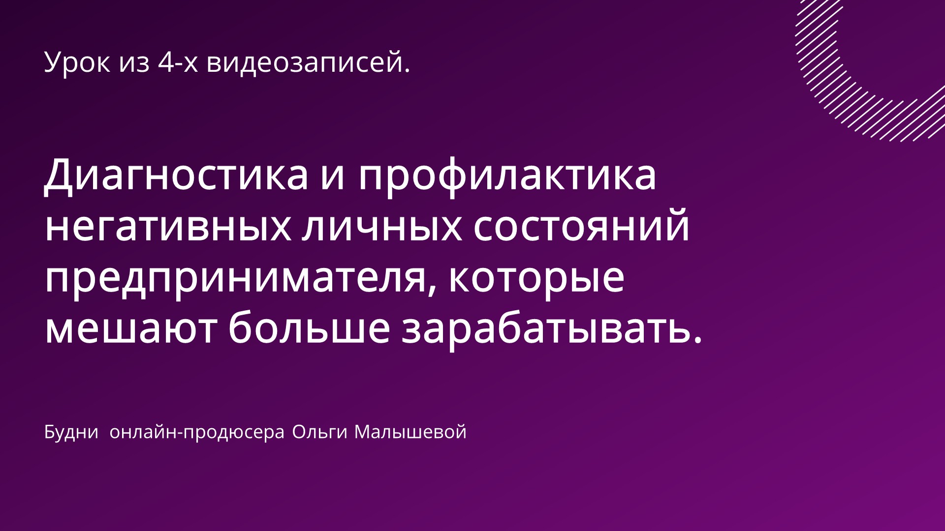 Жмите на кнопку, чтобы активировать бесплатный доступ к уроку: Диагностика и профилактика негативных личных состояний предпринимателя, которые мешают больше зарабатывать.